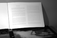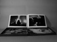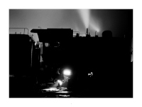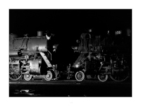 As I structured the form of the book around the sublime in Rose's night photographs I chose to highlight those with the greatest density of black, with emphases on the blur of smoke and steam. Each selection had a particular flaw that made it, to me, a unique trope of Rose's work. A visual story began to form as I continued to review and edit my choices — random or? Image (1) A lone daylight image of small train, black smoke billows from the stack against a background of mountains, foreground of yucca and scrub, train moving right to left, the overall impression is a toy of the imagination, a dreamscape of promise and adventure — a perfect feature of whimsy. In the final image (21) a smoky evening gray mist with little or no detail, an engine sits alone on the roundtable unattended, forlorn and forgotten. I didn't originally have an order in mind but aspects revealed a story, a subtext of a child's imagination and the last, the adult and the end of a long and tired era. The interwoven visual sentences and paragraphs are part of the story that can be built by the viewer according their particular histories, visions and dreams.